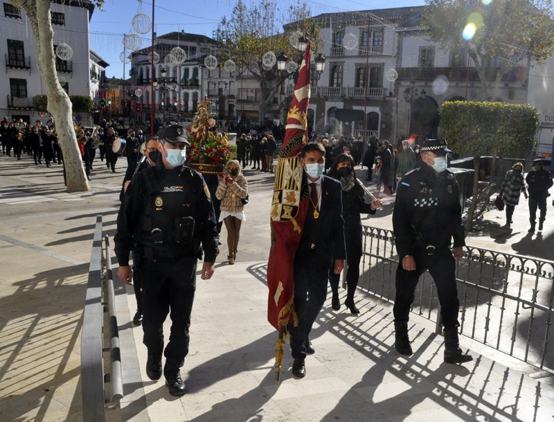 La procesión se inicia en las puertas del antiguo ayuntamiento, cuando el alcalde de Baza, Manolo Gavilán, entrega el estandarte real al concejal más joven de la corporación municipal, que es el encargado de portarlo hasta la iglesia Mayor donde a las 12 horas se celebra la misa anual en honor a la patrona de Baza y a la que asiste la corporación municipal bajo mazas. Aunque ayer de los 21 concejales solo participaron 11 incluido el alcalde. A la procesión asiste una representación de las fuerzas de seguridad del estado como es la Guardia Civil, Policía Nacional y también la Policía Local y del cuerpo de Bomberos de Baza. La Banda Municipal de Musica acompaña la comitiva y al frente de ella su director Tomas Pujol.