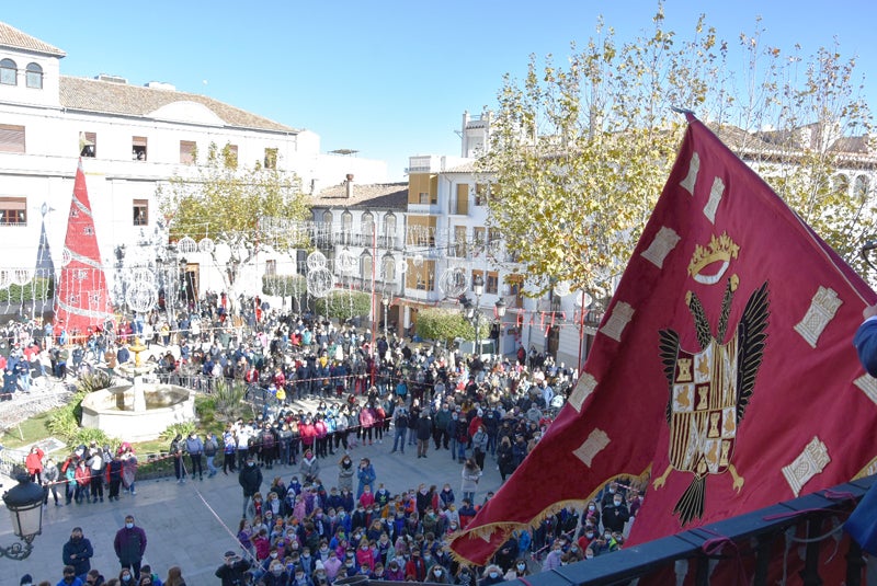 Como cada 3 de diciembre, la Plaza Mayor de Baza volvió a acoger a cientos de bastetanos de todas las edades, para asistir al acto ... de tremolación del estandarte real el popular ¡Baza, que ¡ El año pasado se celebró manteniendo las distancias de seguridad y esta vez se delimitaron zonas para albergar a los alumnos de los distintos colegios.