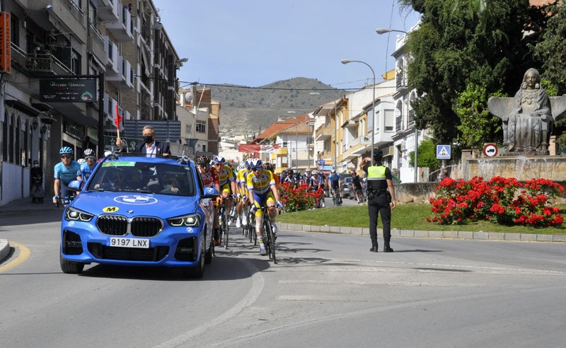 La salida se ha hecho puntualmente a las 10.50h tras el corte oficial de la cinta, dando paso así a un recorrido neutralizado por la ciudad que ha llevado a los ciclistas desde el recinto ferial a calle Ferrocarril, calle Casicas, Avenida José de Mora, calle de Agua, Puerta de Lorca, Avenida de Murcia, Avenida José Salinas, carretera Benamaurel y carretera de Granada, un itinerario en el que han estado acompañados de numeroso público y que ha estado encabezado por el coche oficial de la carrera en el que viajaban Manolo Gavilán y el director de la Vuelta.