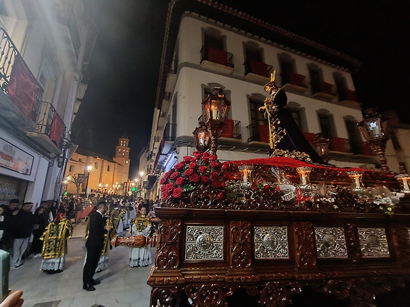 Este año los desfiles procesionales de la Venerable Cofradía de Nuestra Señora de los Dolores, Nuestro Padre Jesús del Rescate y Santísimo Cristo del Descendimiento, celebran el 275 aniversario de la fundación de la Cofradía y el esmero y el trabajo porque todo salga bien se nota, gracias al excelente ambiente que hay en esta corporación de la Semana Santa bastetana. Hay lugares en los que gusta ver pasar al Rescate, uno de ellos es la calle Ancha, que de ancha no tiene nada. Y sobre todo el paso por la carrera oficial, con el incomparable marco de la Plaza Mayor donde todos los desfiles procesionales lucen esplendidos.