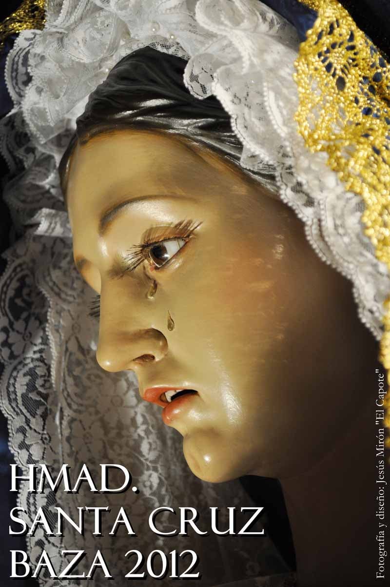Esta mañana ha sido presentado el cartel 2012 de la Hermandad de la Santa Cruz, cuyo autor es por segundo año consecutivo Jesús Mirón ( Capote). Se trata de una imagen de perfil y en primer plano de la Virgen titular de la Hermandad. El joven cofrade y excelente fotógrafo de tan solo 17 años ha logrado una magnifica instantánea sin realizar retoque fotográfico alguno.
