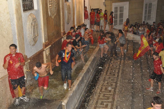 En el Parque de la Constitución se dieron muchas personas para presenciar el partido en la pantalla gigante que el Ayuntamiento y Vivacable habían instalado. ... Y desde este punto las gentes en su inmensa mayoría jóvenes se trasladaron hasta el cruce del carril. Mientras otras muchas personas organizaban una caravana de coches que pasearon una y otra vez por las calles de Baza. Tras el cruce del Carril, las marabunda se traslado hasta los Caños Dorados, el lugar donde cada 6 de septiembre se dan cita miles de personas para recibir y bañar al Cascamorras, esta vez los que se bañaron fueron los más atrevidos y algunos de ellos imitando al popular personaje de Juan Pedernal se pusieron a ?jurar? bandera como lo hace el Cascamorras, por cierto uno de ellos, Alex Baena, tampoco se perdió esta celebración en los Caños Dorados, quizás pensando en volver a representar al popular personaje alguna vez más. La celebración se celebro sin incidentes y solo una persona no española, pasada de bebida se empeño en ser arrestado por la Policía Local. Galeria de fotos de la celebracion.
