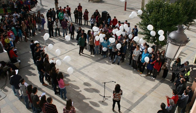 Estudiantes de secundaria de Baza han sido los protagonistas del acto central contra la violencia de género que se ha celebrado hoy viernes día 23 de noviembre bajo el lema ?Cómplices en el cariño, no en el maltrato?. A partir de las 11.45 de la mañana en la Plaza Mayor, los alumnos de 3º y 4º de secundaria han leido un manifiesto elaborado por ellos mismos y después han soltado globos blancos en recuerdo por las víctimas mortales que ha dejado la violencia de género este año.