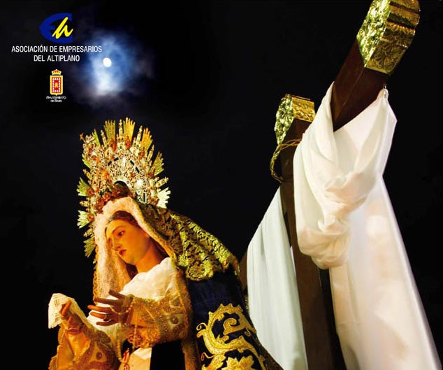 Al acto de presentación acudieron el presidente de la Federación de Hermandades y Cofradías , Jose Gabriel López Carreño, el Hermano Mayor de la Santa Cruz, ... Luis Miguel López García, el alcalde de Baza, Pedro Fernández Peñalver, la concejal de Cultura, Yolanda Fernández y el presidente de la Asociación de Empresarios, Simón Maestra. La fotografía será la que represente durante la Cuaresma a las hermandades de pasión este año y estará en la calle el próximo Miércoles de Ceniza. Además será presentada en FITUR a finales de Enero para dar a conocer la Semana Mayor de Baza en este evento turístico de primer orden. Del mismo modo el cartel oficial será exaltado por José Ramón Ibarra Mañas el jueves 15 de Febrero en un acto que tendrá lugar en la Iglesia Mayor de Baza, sede canónica de la Hermandad de la Santa Cruz. El autor del cartel Pedro Carrión, explica que la foto la realizó durante una de las paradas del paso de la Virgen en la calle del Agua, en el giro a la calle Ancha. Su objetivo era realizar una composición interesante donde apareciera la luna enmarcando la Virgen al Pie de la Cruz y sin que aparecieran ningún edificio.Lo que consiguio, lastima que la publicidad que aparece junto a la luna, rompa la compòsición del fotógrafo. Pedro Carrión que es también el Hermano Mayor de la Hermandad de Nuestro Padre Jesús Nazareno y María Santísima de la Victoria en su Pena y Dolor, recuerda que existe cierta dificultad en realizar fotografías en las estaciones de penitencia de Semana Santa de Baza pues el tiempo a veces es escaso. Aunque él sabe apañárselas muy bien pues en los últimos siete años, ha logrado ganar la foto del cartel anunciador de la Semana Santa de Baza en cinco ocasiones.