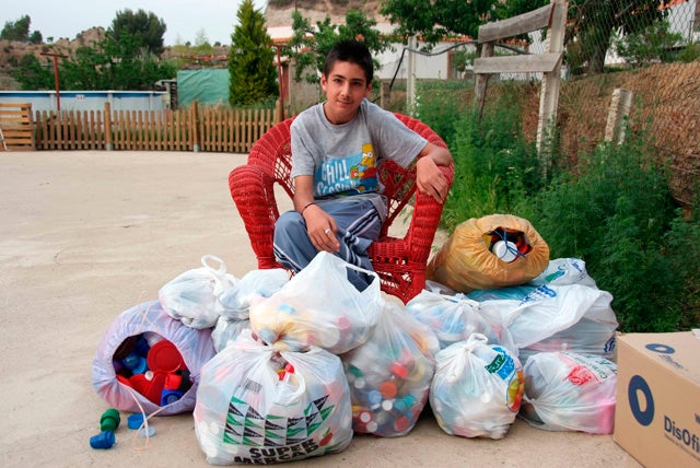 Álvaro en el patio de su casa, rodeado de bolsas de llenas de tapones Cruz Roja de Baza ha colaborado con la campaña que la familia de Álvaro viene realizando para conseguir fondos que posibiliten investigar la rara enfermedad que padece, denominada Ataxia ?Telangiectasia. Una de las formas ideadas para lograr dinero es recogiendo tapones de plástico. Cruz Roja de Baza ha colaborado en esta campaña y la semana pasada un grupo de voluntarios de desplazaron hasta Benalua de Guadix para hacer entrega de un cargamento de tapones a la madre de Álvaro. En total le entregaron 15 cajas grandes repletas de tapones.