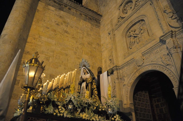 Poco antes de la salida, en el interior del templo se celebro un encuentro entre el Cristo de los Méndez y la Virgen de la ... Santa Cruz. Horquilleros del Cristo de los Méndez trasladaron al Cristo por el pasillo central de la iglesia y lo dejaron frente al altar mayor. Mientras por un lateral avanzaba el paso de la virgen hasta llegar a la altura del Cristo, momento que fue aprovechado por el párroco para realizar una oración. Poco después fue cuando comenzó la procesión del Martes Santo en Baza. Este año y como ya ocurriera el pasado, la luna llena no falto a su cita y una vez más su presencia fue inmortalizada por los numerosos fotógrafos, unida a la imagen de la Virgen que en su día realizo el prestigioso imaginero granadino Domingo Sánchez Mesa. Tras bajar a la Plaza Mayor, el desfile procesional se encamino hacia la calle Alhóndiga para realizar su recorrido completo, bajando hasta la calle Ancha y subir por la calle Monjas otra vez hacia la Plaza Mayor para realizar el paso de tribuna, justo antes de ascender la rampa hacia el interior de su sede canónica.Este año la Hermandad de la Santa Cruz, estreno un llamador del paso realizado por una orfebrería cordobesa, donado por miembros del grupo joven. También fue estreno el fajín bordado en terciopelo azul marino realizado por una camarera de la Virgen.El acompañamiento musical fue de la Banda Municipal de Música ?Ciudad de Atarfe?. Ya puedes ver la Galeria de fotos y video de la salida de la Virgen de la Santa Cruz