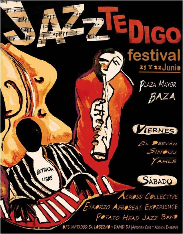 Entre las novedades de esta edición destaca la incorporación de una nueva agrupación, con un total de seis, y dos pincha discos que amenizarán los ... cambios de grupos en la noche del sábado. La entrada a las dos jornadas del festival es gratis.El Jazz te digo comenzo ayer viernes día 21 de junio a las nueve de la noche en la Plaza Mayor de Baza con la formación bastetana El Desván, despues le seguieron las agrupaciones Sinouj y Yahlé. Para el sábado será el turno de los acortes de las formaciones granadinas Across Collective y Eskorzo Afrobeat Experience y Potato Head Jazz Band. Además se contará con los DJ invitados: Sr. Lobezno, David DJ. En la organización de esta actividad colabora el Ayuntamiento de Baza, que se encarga de los gastos derivados de la puesta en escena (escenario, sonorización e iluminación y también los wc portátiles), que tienen un coste cercano a los 2.500 euros.
