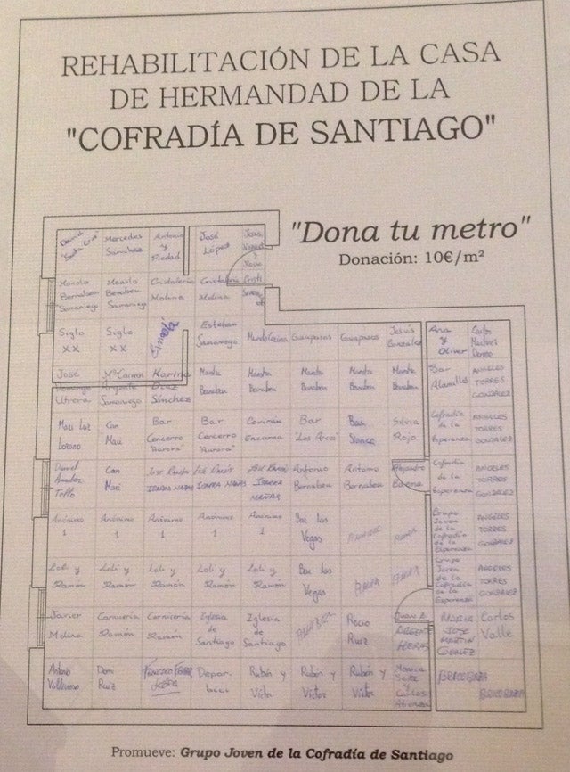 La Cofradía de Santiago recuerda que al salón de tronos y al baño de la planta baja, finalizados hace 10 años, se añadirán ahora la ... entrada y escalera de acceso a la segunda planta que estará compuesta por terraza, salón, despacho y baño. También se finalizará un altillo para almacenar enseres de la hermandad. En total más de 100 metros cuadrados que hasta ahora no podían ser utilizados y que estarán al servicio de los cofrades. Para costear las obras, unas de las iniciativas que surgió fue la de realizar un plano de la planta superior del edificio para que cada persona, negocio o institución colaborara aportando al precio de 10? su metro cuadrado. Esta iniciativa ha sido acogida con un gran entusiasmo y en muy poco tiempo se ha completado este plano, que ya está enmarcado y preparado para ser colocado en la Casa de Hermandad. Tan grande ha sido el entusiasmo que muchos cofrades y amigos cercanos se han quedado sin colaborar y han pedido que se realice otro plano. El Grupo Joven ya lo ha realizado, esta vez del tramo de escaleras que sirva también para ayudar a la financiación de esta parte de las obras, una de las más caras que resta por financiar. El Grupo Joven de Santiago, anima a quienes quieran colaborar lo hagan dirigiéndose a cualquier integrante del Grupo Joven o de la directiva de la Hermandad.