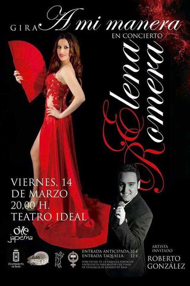 Elena Romero fue finalista en la sexta edición del programa de Canal Sur ´Se llama Copla´ Baza acoge la presentación del concierto de la gira ´A mi manera´, de Elena Romera, la que fuera finalista de la sexta edición del programa de la televisión autonómica ´Se llama copla´´, un concierto que se celebrará hoy viernes, 14 marzo, a las 8 de la noche en el Teatro Ideal - Auditorio Enrique Pareja. Parte de la recaudación se donará al fondo de emergencias para Mujeres Víctimas de Violencia de Género de Baza.