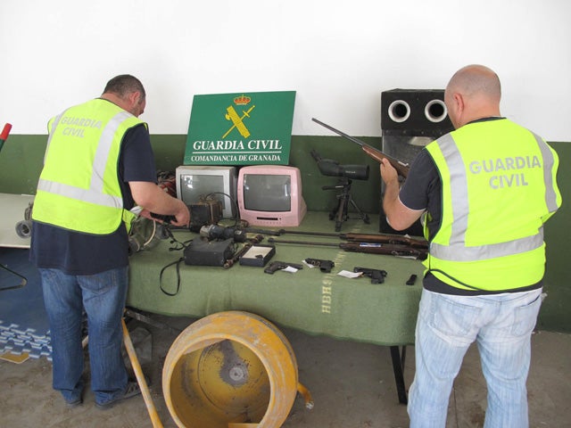 La Guardia Civil ha intervenido una carabina de calibre 22 mm., una pistola de calibre 38 mm. y otras armas.Los detenidos han sido presuntos responsables de al menos tres robos de gasóleo tipo B en las provincias de Granada, Almería y Málaga. La Guardia Civil ha detenido en Baza a dos individuos de nacionalidad rumana, de veintiséis y veintiocho años de edad respectivamente, como presuntos autores de los delitos de tenencia ilícita de armas, robo y receptación. La Guardia Civil ha intervenido en esta operación una carabina de calibre 22 mm., una pistola de calibre 38 con cargador, una pistola detonadora calibre 9 mm. con cargador y dos carabinas de aire comprimido, tras un registro realizado en el domicilio de los jóvenes detenidos.