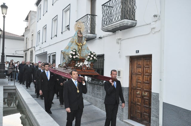 La Virgen de la Piedad procesionó en rosario de la Aurora en acción de gracias por el nombramiento como Patrona de Baza realizado el pasado 8 de septiembre. Ahora casi un mes después y coincidiendo con la visita pastoral a Baza del obispo Ginés García, se ha celebrado un rosario de la Aurora, en el que por primera vez participo la imagen de la Virgen de la Piedad. Antes de iniciarse el recorrido por el centro de la ciudad, Ginés García, bendijo unas nuevas andas de ´traslado´ que han sido donadas por una familia bastetana y realizadas en los talleres de Hermanos Jiménez, también de Baza.