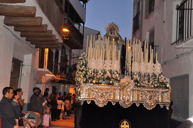 Tras el paso del Cristo, va la Virgen de la Soledad, una imagen de gran belleza, a la que se le profesa una gran devoción ... en toda Baza. Hace años, no muchos, la Soledad también salía en viernes Santo detrás del Santo Entierro. Ya no lo hace, pero la intención de la cofradía con sede en la Plaza de la Merced, es que la María Santísima de la Soledad, desfile por las calles bastetanas, el Sábado Santo y de paso completar toda la Semana Santa con estaciones de penitencia. No obstante el sábado se podrá visitar la iglesia de la Merced, ahora de la Piedad, donde la Soledad, estará de luto riguroso. Personas que han perdido algún ser querido recientemente, suelen acudir a vivir momentos de recogimiento. Como suele ser habitual, la estación de penitencia de la Soledad y el Cristo de la Misericordia, fue seguida por muchos bastetanos, en la salida, en la Plaza de San Juan, donde están los famosos `Balcones de Palo y desde donde ayer el horquillero del Cristo de la Misericordia, Ramón Rodriguez Carpio, canto una saeta llena de sentimiento, como solo él puede y sabe hacerlo. El día anterior, Martes Santo, también le canto una saeta a la Virgen de la Santa Cruz a su paso por la calle Ancha. Otro momento muy seguido fue el encuentro que en el cruce del Carril, protagonizaron el Cristo y la Soledad dos horas después de iniciado el desfile procesional, al que asistieron un buen número de penitentes y un nutrido grupo de `Manolas. Los estrenos de este año fueron dos ciriales y cuatro jarras realizados por orfebrería Aragón y Pineda de Motril. El acompañamiento musical de la procesión de la Soledad estuvo a cargo de la Banda de Cornetas y Tambores Centuria Nazarena de Linares y la Banda de Música Virgen del Carmen de Durcal.