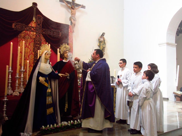 Todo el mundo cofrade bastetano, acudió en la mañana de ayer a la bendición de las dos nuevas titulares de la Cofradía del Barrio de Santiago va a incorporar al paso de Cristo del Descendimiento, que son María Santísima del Rocío en sus Misterios Dolorosos y un San Juan Evangelista, obra del imaginero malagueño Juan Vega. Ambas imágenes, que desfilaran por primera vez en la mañana del próximo Viernes Santo, forman parte de un proyecto de la nueva Junta Directiva de la Cofradía de Santiago que va a completar el calvario que representa el paso del Cristo del Descendimiento.