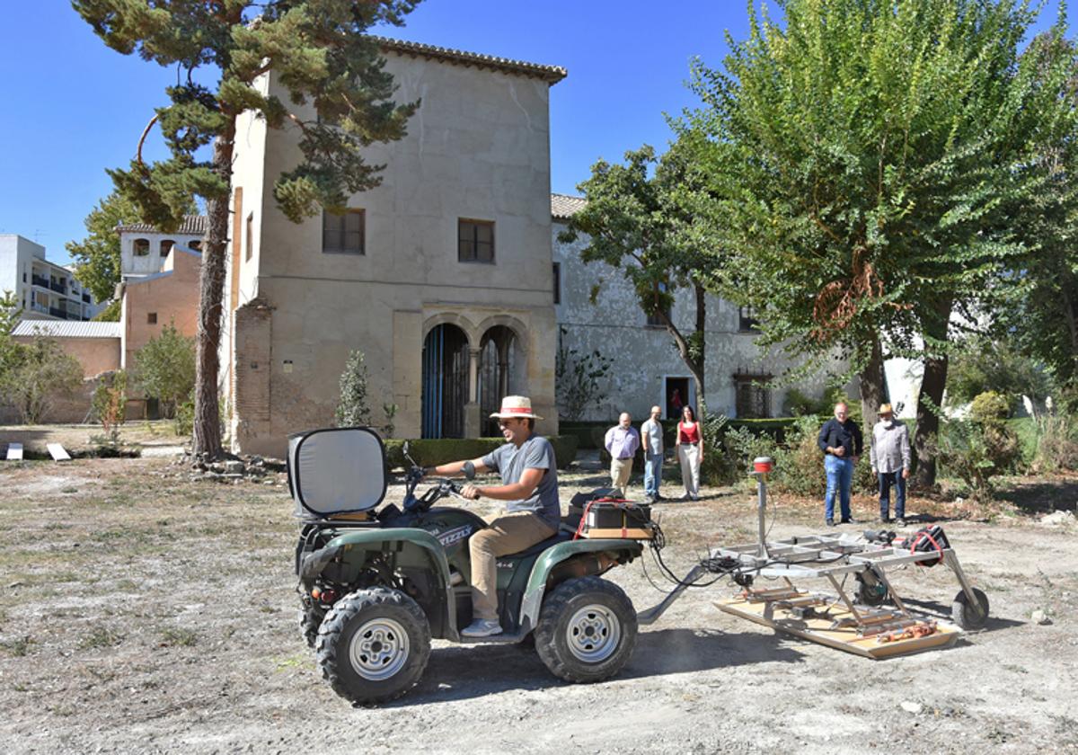 Al mismo tiempo, el profesor del departamento de Prehistoria de la Universidad de Granada, José Antonio Peña, junto con algunos ayudantes, han realizado una prospección geofísica del suelo del palacio y de los jardines para conocer, lo que hay debajo de lo que se ve a simple vista. Se ha empleado la técnica del georradar, tanto con herramientas de pequeño tamaño para los espacios más reducidos, como otras de mayor volumen para los espacios abiertos. Uno de los objetivos en este caso es saber si el palacio se construyó en este emplazamiento porque allí había antes una almunia musulmana, lo que le daría mayor relevancia y notoriedad histórica. El técnico de patrimonio municipal apuesta por esta posibilidad e incluso explica las circunstancias que lo evidencian sobre el jardín actual. Junto con el análisis geofísico, otro grupo de profesores universitarios expertos en Geología van a llevar a cabo una muestra de morteros y sales del edificio para determinar el estado de los elementos constructivos del monumento, lo que podría indicar sus necesidades a la hora de la consolidación de paredes y otros elementos arquitectónicos.