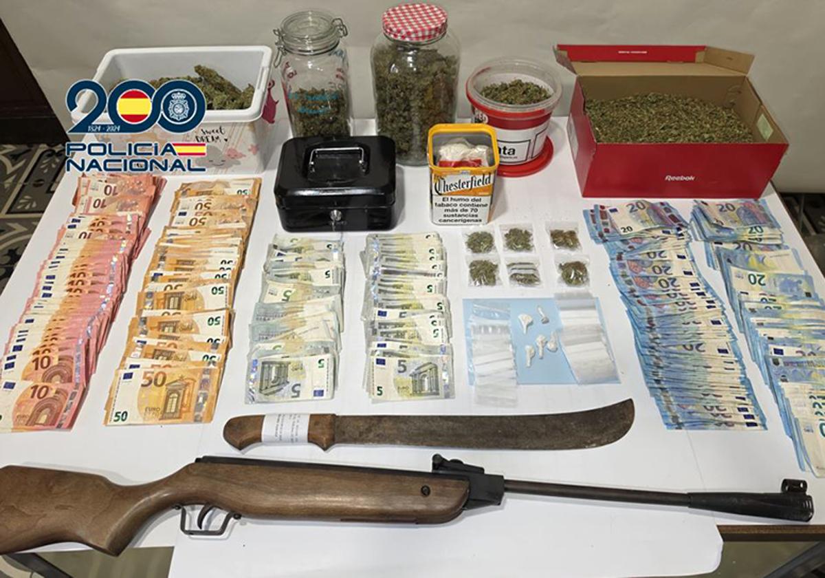 En la realización del registro, además del principal investigado, se encontraban en la morada dos personas más, hombre y mujer, de los cuales ha podido probar la investigación su participación activa en los delitos contra la salud pública y tráfico de drogas. En dicha vivienda los agentes pudieron confirmar todos los indicios de las pesquisas previas, encontrando en la misma marihuana, cocaína y heroína. Además, se localizó entre las diferentes estancias una gran cantidad de dinero en efectivo fraccionado, superando los 8.300 euros. También se aprehendieron dos patinetes eléctricos que utilizaba el detenido para el transporte de la droga, cuatro teléfonos móviles, un machete, una carabina de aire comprimido y una cámara de video vigilancia.