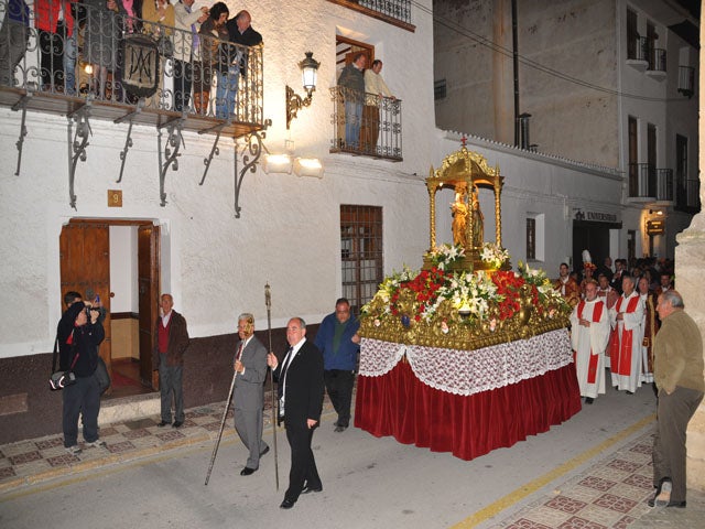La procesión encabezada por los Hidalgos del Evangelio, comenzó el desfile hacia la Plaza Mayor de Huéscar, donde esperaban a las Santas cientos de personas ... que las recibieron entre vítores de bienvenida. Cuando el trono se paro ante la puerta noble del Ayuntamiento, todos los presentes, con el acompañamiento musical de la Banda Municipal de Música, cantando el himno en honor a Alodía y Nunilón. Poco después la comitiva continuo hasta la iglesia de Santa María la Mayor donde se celebro la recepción religiosa y las Santas Alodía y Nunilón se quedaran durante 50 días antes de que lunes de Pentecostés los oscenses las suban en romería hasta las inmediaciones de la ermita y a las 12 de la mañana sean entregada de mala gana a los vecinos que La Puebla de don Fadrique que ya cuentan los días que faltan para recibir a las que también son sus patronas.