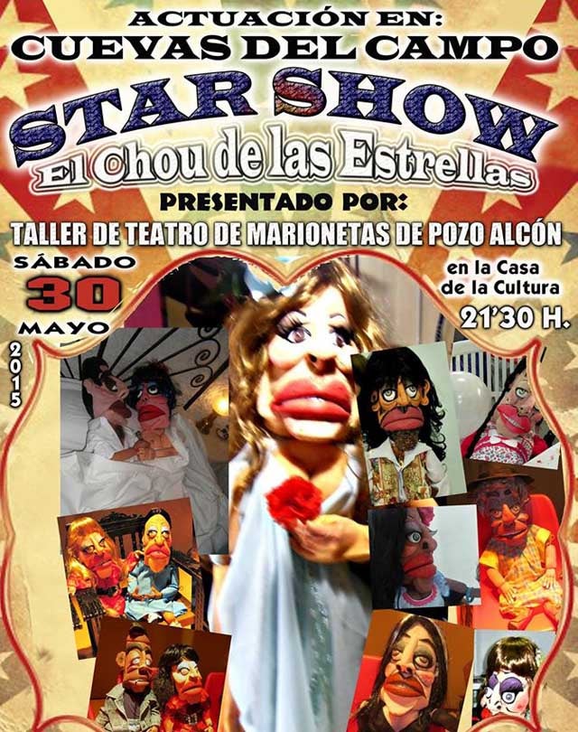 El Taller de Teatro Marionetas de Pozo Alcón representa este sábado 30 de Mayo en Cuevas del Campo ?Star Show, el Chou de las Estrellas?, una obra original de Rosa Nogales. La puesta en escena es el resultado del Taller Municipal de Marionetas de Pozo Alcón que ha durado varios meses y donde trece personas han construido su propia marioneta, aprendiendo su manipulación e interpretación.