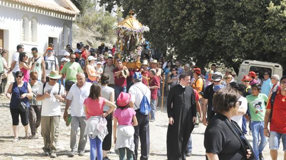 La última parada se realiza a escasos metros de la ermita, en una piedra para que se produzca el último relevo que debe de ser de personas nacidas en Puebla de Don Fadrique. Hasta el lugar acudió el cura párroco de la Puebla, Juan Luis García, quien rezo unas oraciones, instantes antes recorrer los últimos metros con las Santas que fueron instaladas en la ermita, donde permanecerán hasta el primer día de Pascua de Resurrección, que serán bajadas por los vecinos de Huéscar. A los 50 días, el lunes de Pentecostés, las Santas son subidas en romería por las gentes de Huéscar para ser entregadas de mala gana a sus vecinos de Puebla, que se las bajan a su pueblo y 50 días después las devolverán otra vez a su ermita, y así año tras año, siglo tras siglo.