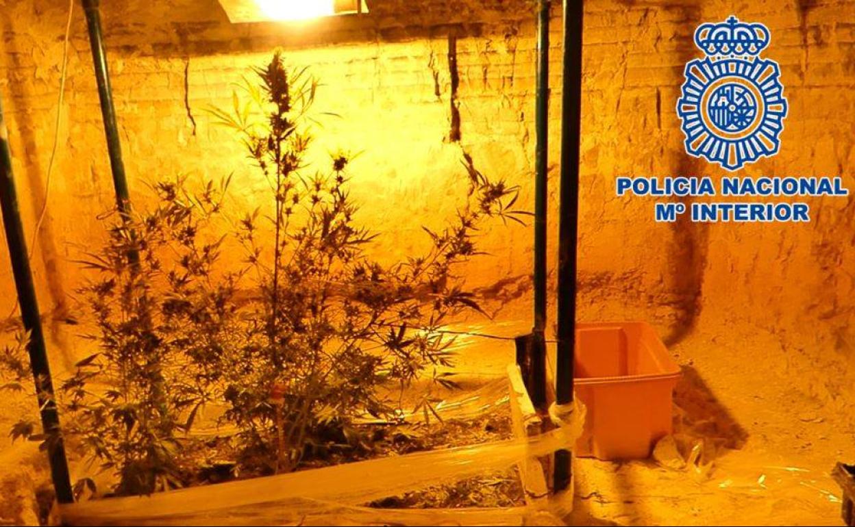 Una vez detenido el presunto agresor los agentes actuantes pudieron percibir, en el mismo lugar donde se encontraban, el fuerte olor típico de las plantas de cannabis sativa, centrándose ahora en encontrar el origen del mismo. Tan sólo unos instantes más tarde hallaron en el cerro dos oquedades excavadas a modo de cueva a una profundidad de metro y medio en cuyo interior se encontraron un total de ocho plantas de la mencionada especie. En el mismo lugar los agentes encontraron diversos elementos destinados a favorecer el crecimiento de las plantas como abono, útiles de cultivo, transformadores eléctricos, una lámpara y un ventilador, así como un sistema de cableado eléctrico.