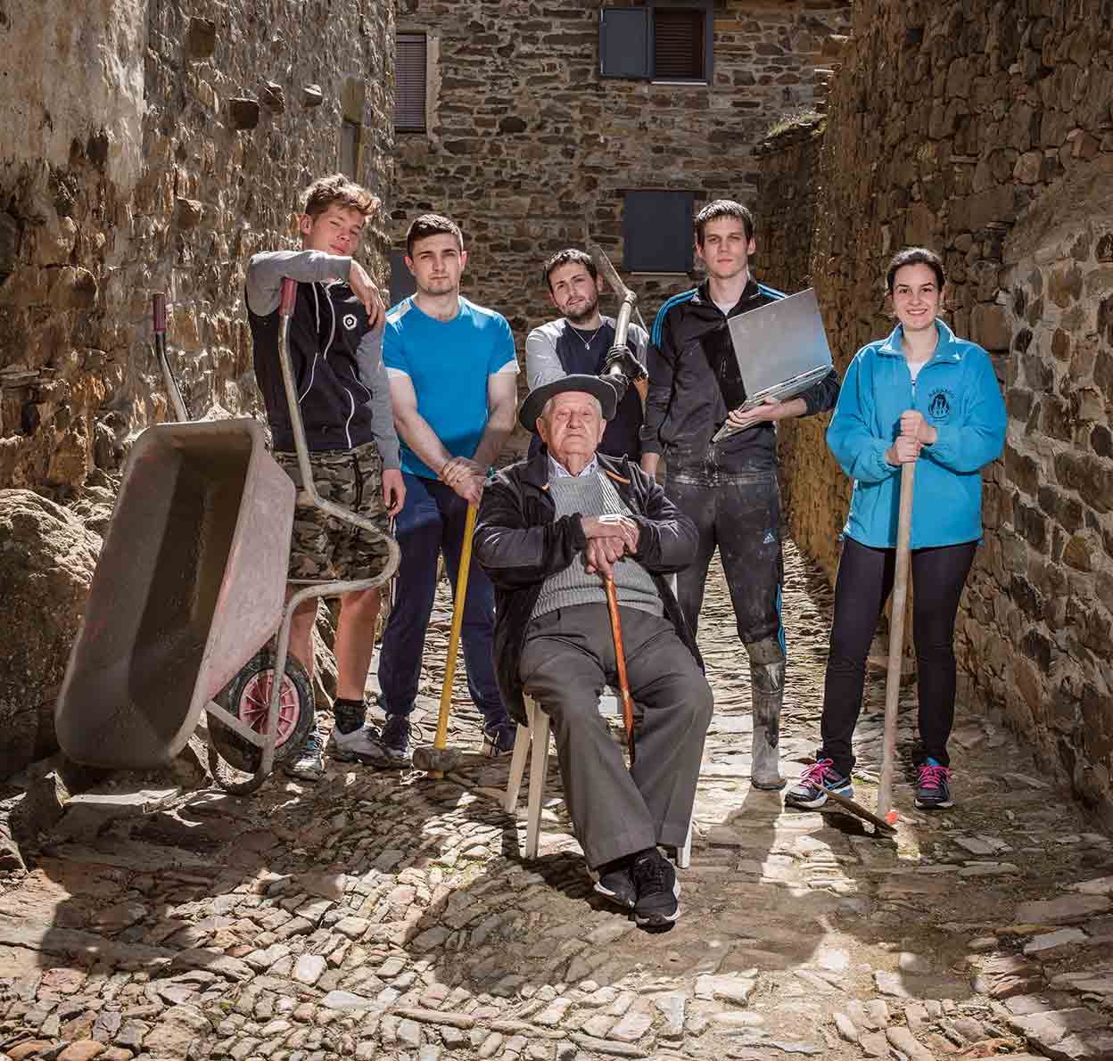 Por ellos no va a quedar, desde luego. Se reparten picos, palas, carretillas... No han vivido aquí, excepto algunas vacaciones de verano, pero se plantean, por primera vez, hacer de este lugar un hogar donde pasar largas temporadas trabajando o descansando, incluso echar raíces, aunque no sea la prioridad para una generación acostumbrada a moverse: becas Erasmus, vuelos low cost... Durante el confinamiento, una pareja se instaló en el pueblo y abrió una tienda on-line. Venían de Australia. Ya hay precedente.