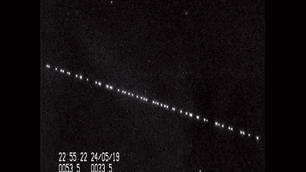 Si miras al cielo durante un rato antes de que amanezca o poco después del anochecer, es probable que veas pasar una hilera de luces. No son ovnis. Se trata de los satélites Starlink del magnate Elon Musk [en la imagen de arriba, según una