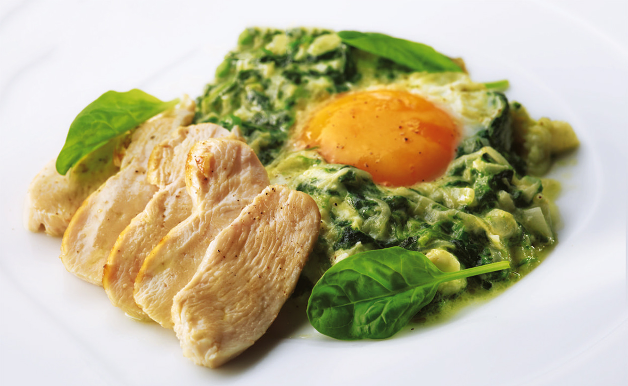 Ingredientes. 500 g de hojas de espinaca, aceite de oliva, 3 cebolletas frescas cortadas en finas rodajas, 125 g de nata fresca, una pizca de nuez moscada rallada, sal y pimienta. Además, para acompañar, pechuga de pollo y huevos.