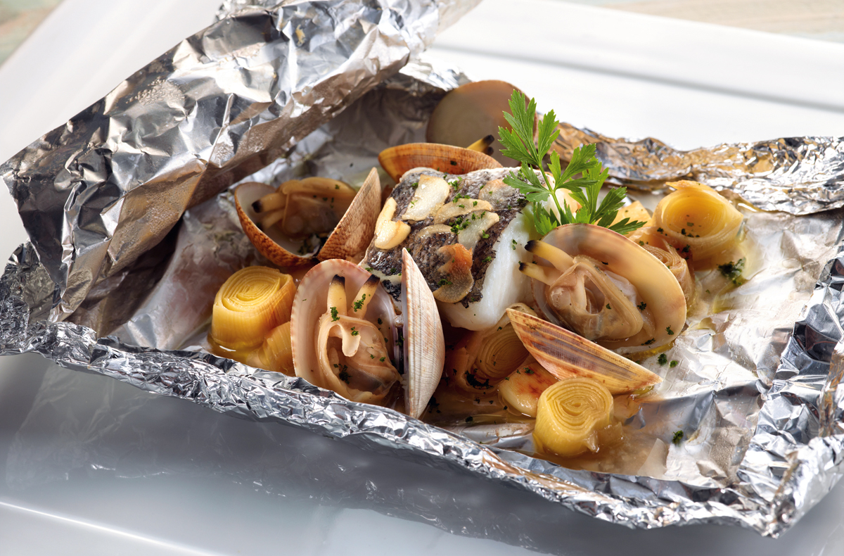 Se coloca en el papel de aluminio y, sobre él, el pescado y las almejas.