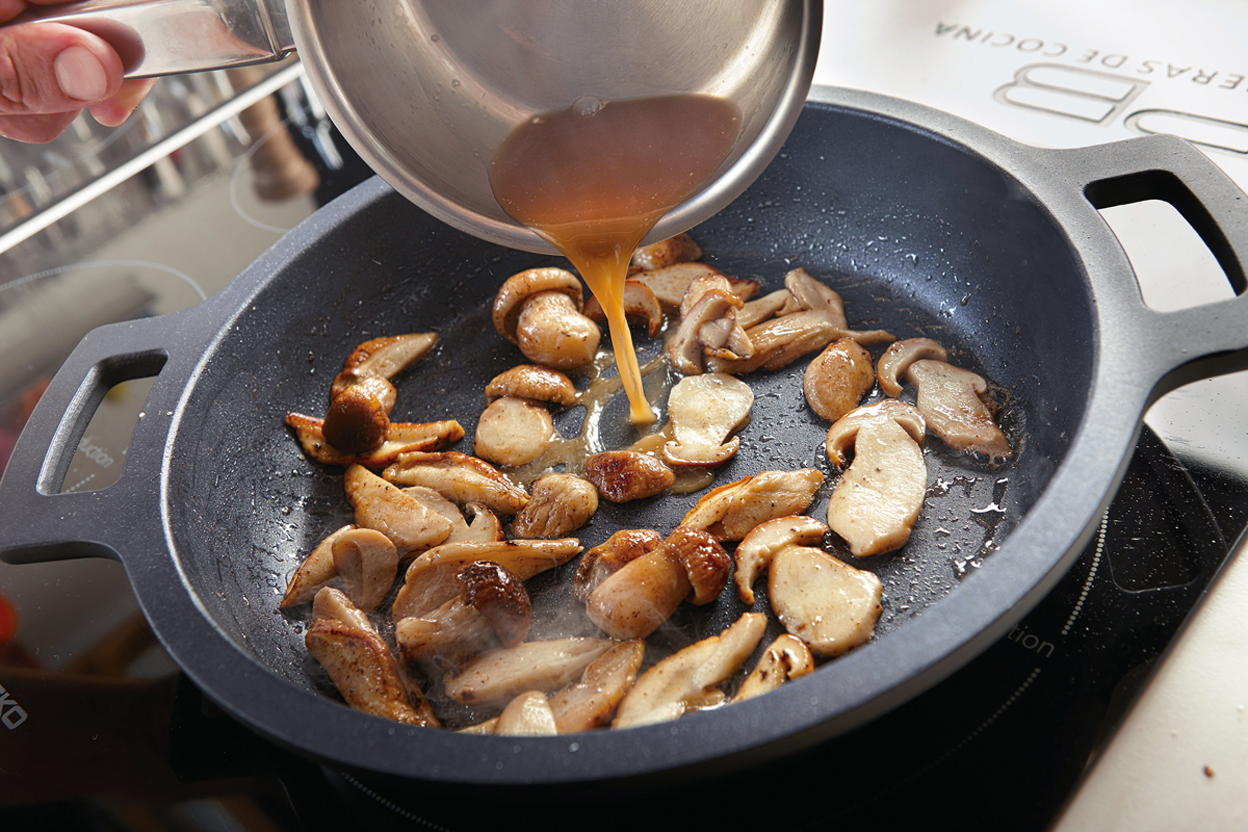 Para saltear setas, no conviene llenar mucho la sartén. De esta manera, haciéndolas poco a poco, los jugos de los hongos se evaporan al instante y estos se tuestan rápidamente.
