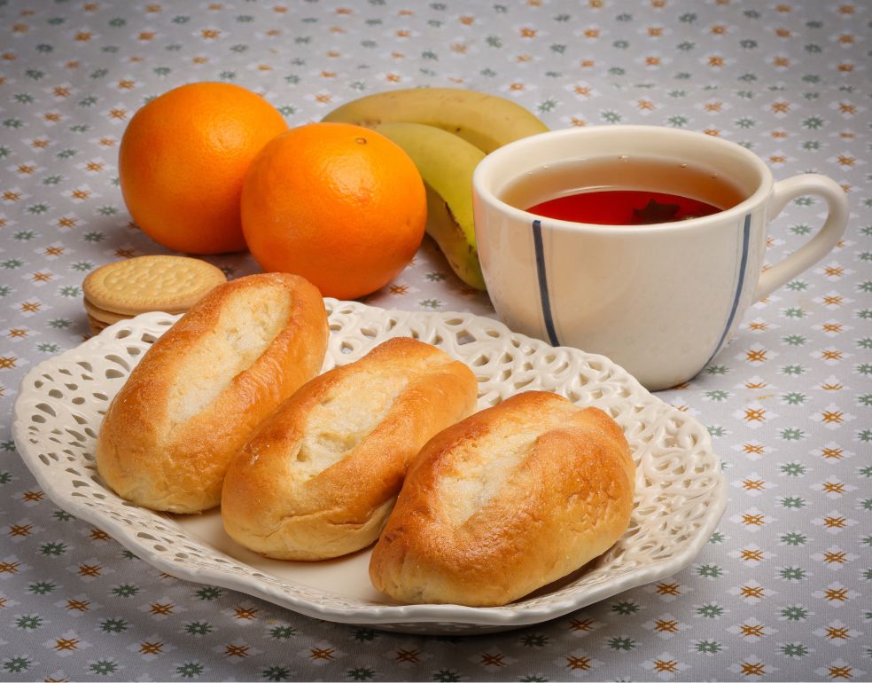 «Tomo varias tazas de té con unas nubecitas de leche de arroz o almendras. Una papilla de plátano, galletas y zumo de naranja. Y un bollo suizo con mermelada».