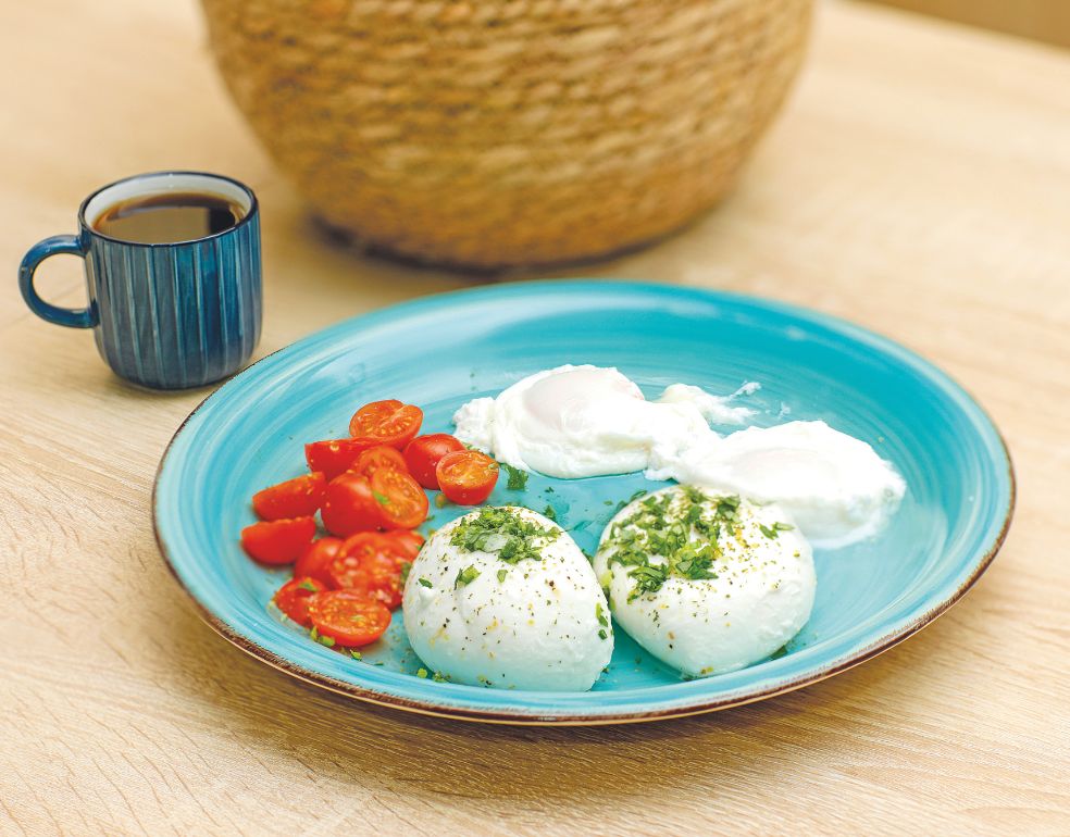 «Un par de huevos poché con burrata, aceite de oliva virgen, pimienta molida y rúcula, y una tostada de pan. Además, una taza de café solo».