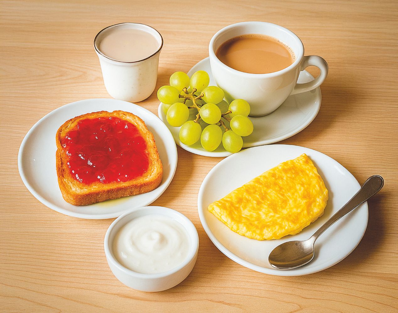 «Una tostada con aceite y mermelada de fresa; un yogur de coco, que mezclo con uvas moscatel verdes; un café con leche de almendras, y una tortilla francesa».