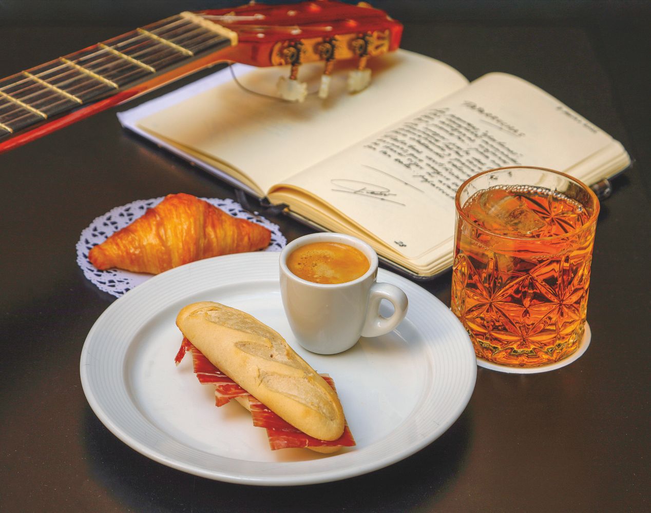 «Un bocadillo de embutido, de sobrasada o de queso, con tomate untado en el pan; un zumo de manzana, y mojo alguna pasta en un café con leche».